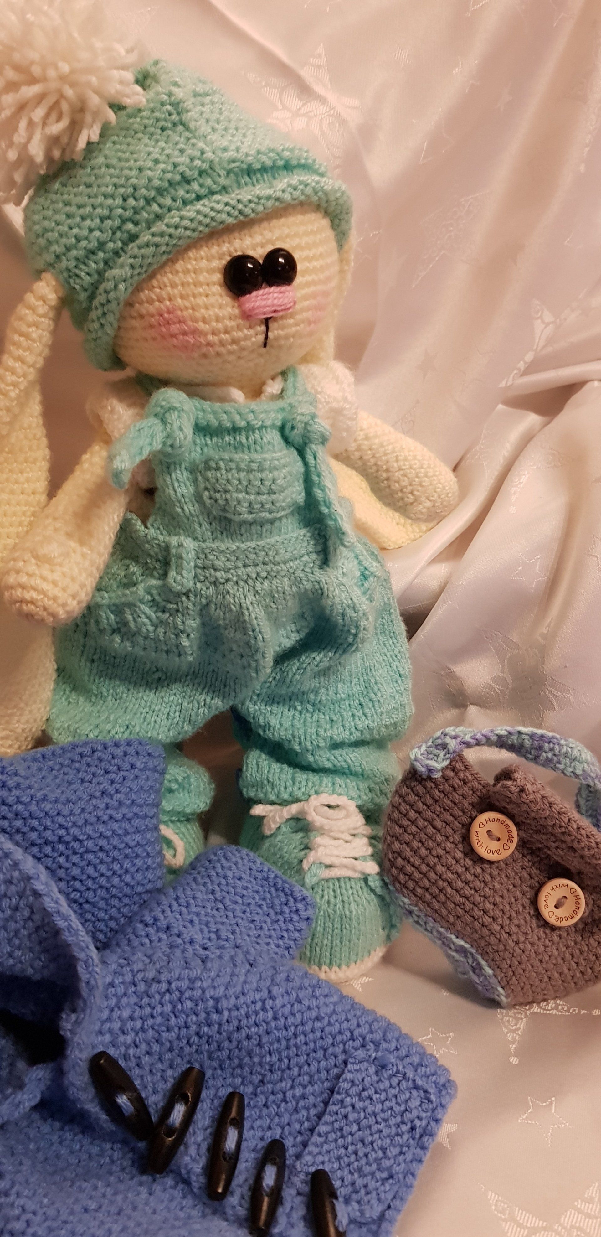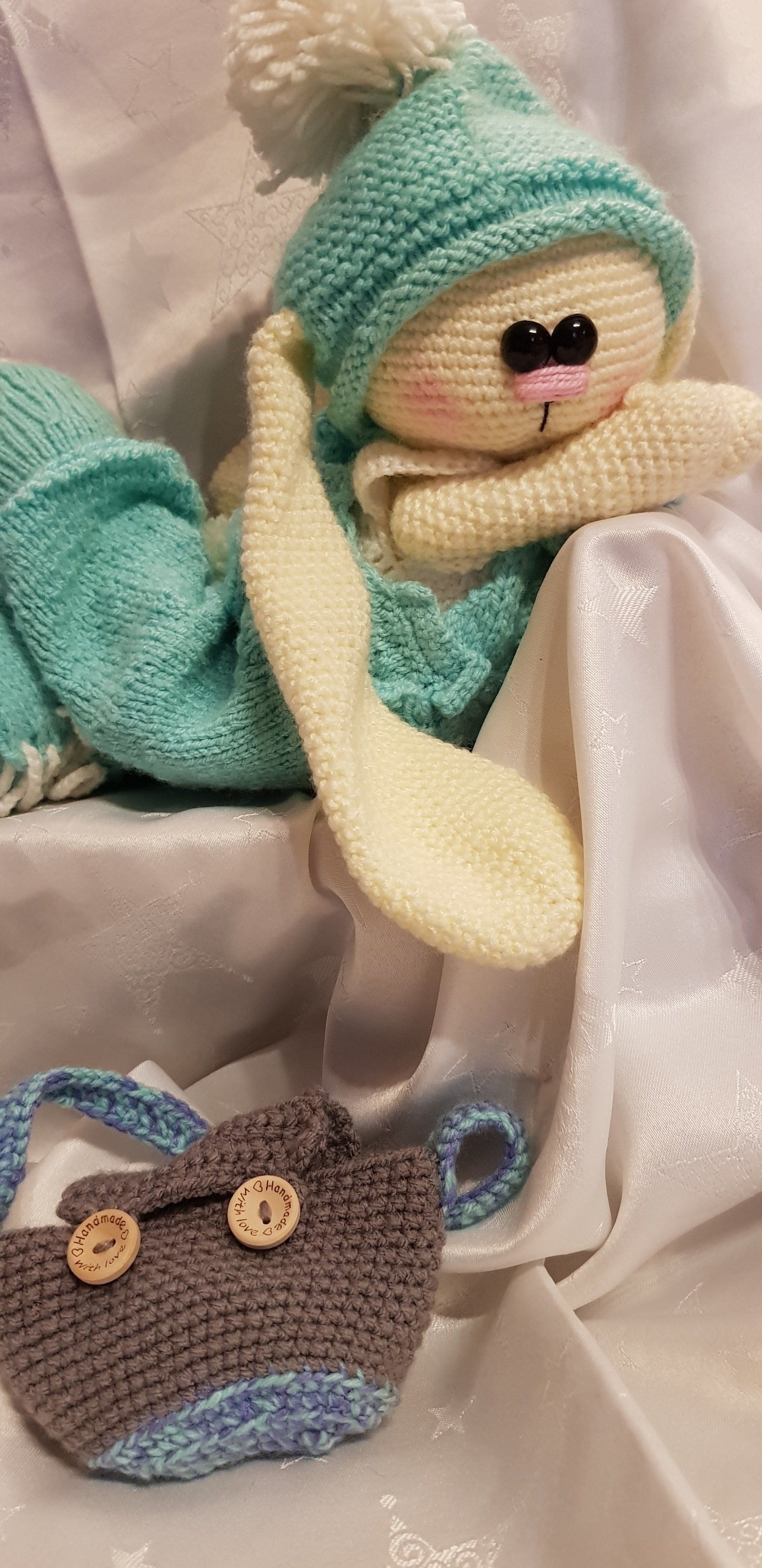 Das zuckersüße Häschen mit der Kleidung in mint und blau gehalten, ist sehr beliebt bei Kindern zum Spielen und Kuscheln.